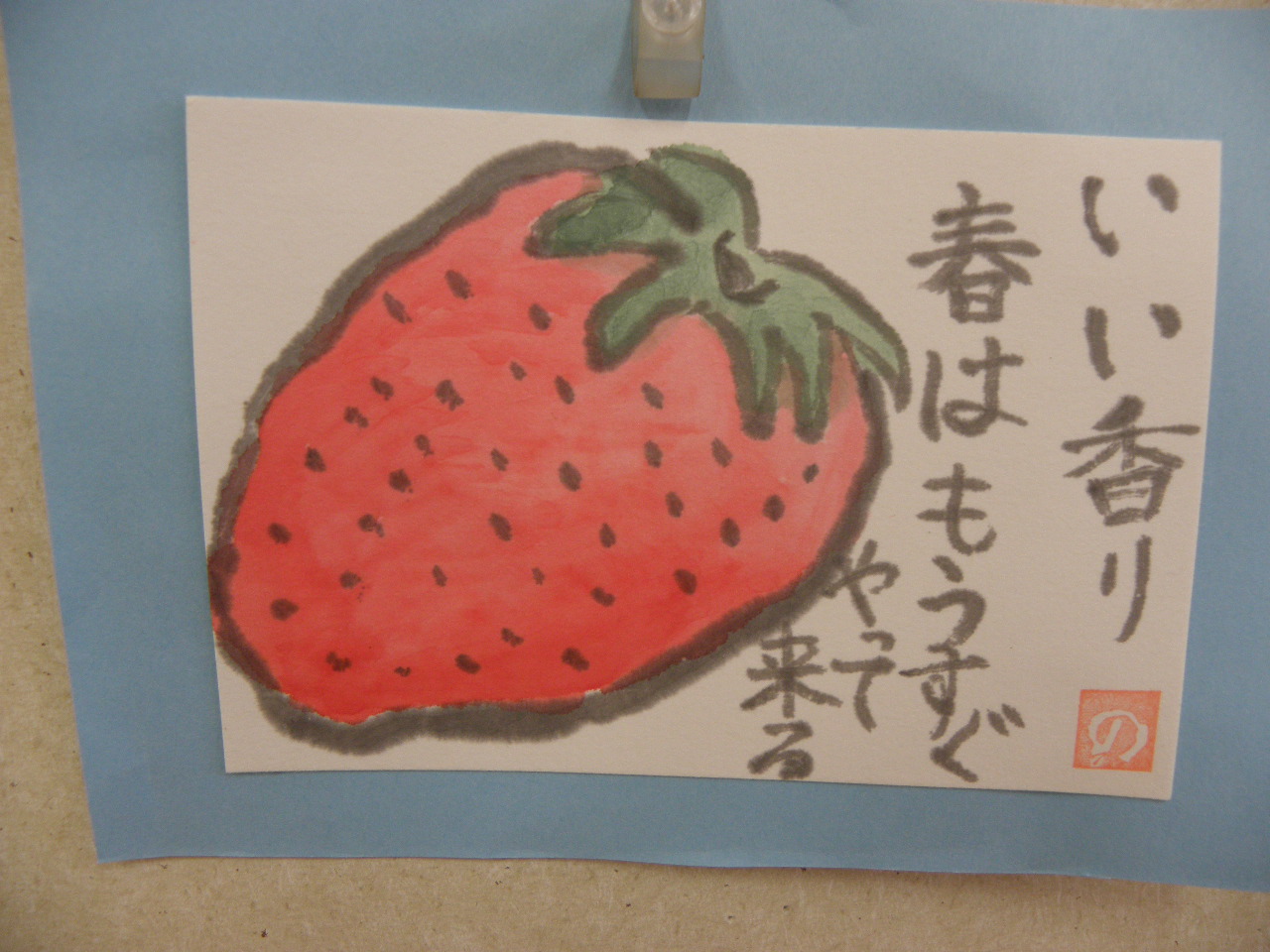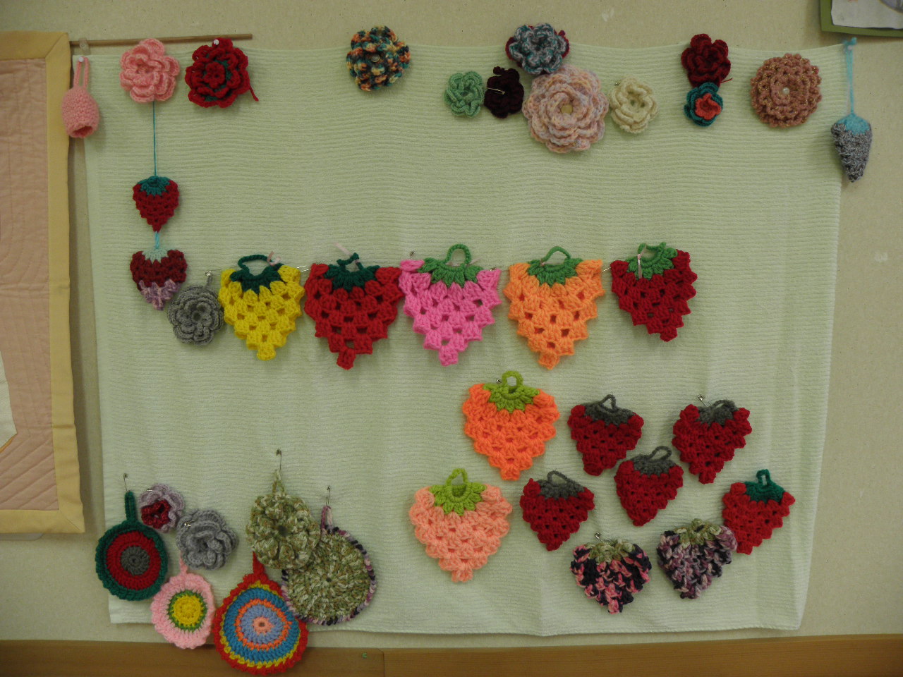 ご利用者様とセンター長の共同制作で、お花はモチーフ、いちごはアクリルたわしです。これからもっと花が咲きいちごが実る予定です!