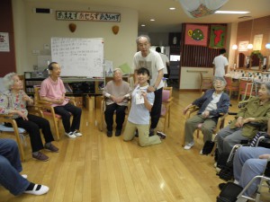 ボールを回して、止まったところの人が立って自己紹介をします。職員の肩に掴まって立ち上がった瞬間でした。