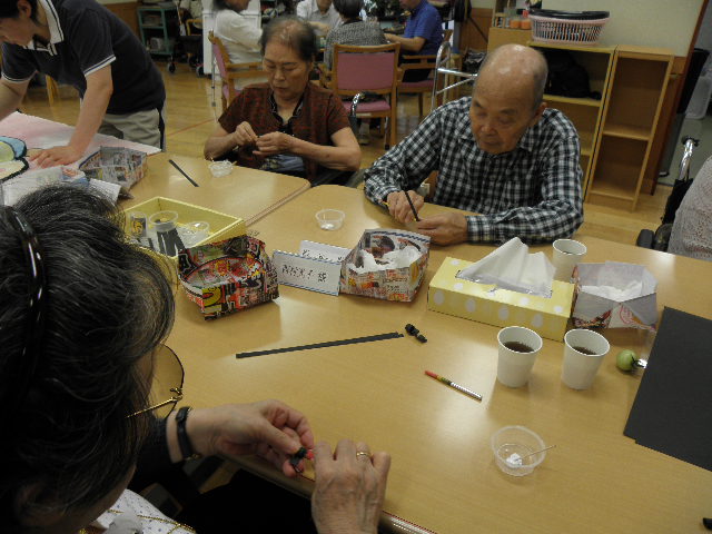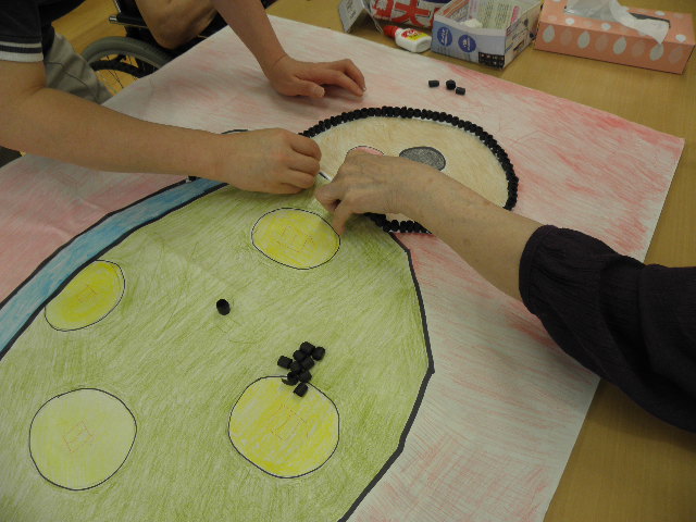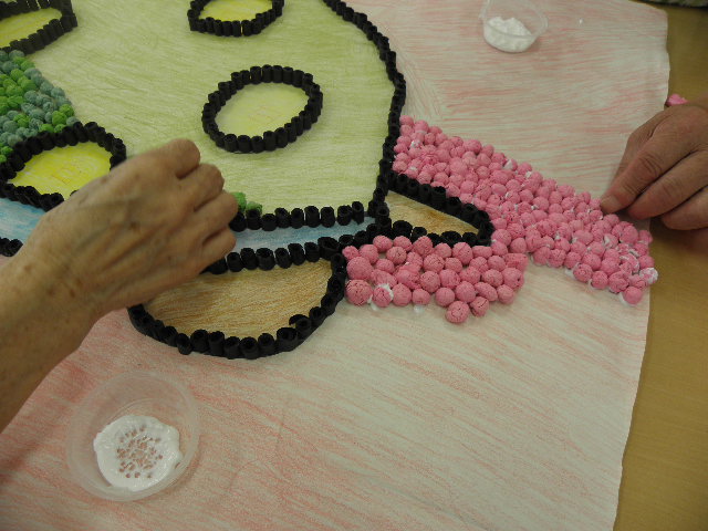 細い紙を丸めたり、小さな花紙を隙間なく貼っていく作業は指先のリハビリにもなります。適当にではなく、順序よくキレイに貼ることによって素晴らしい作品として仕上がります。(過去の作品は「制作中!」をご覧下さい)