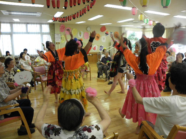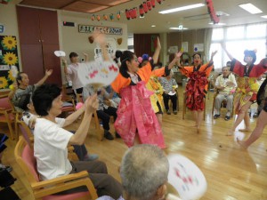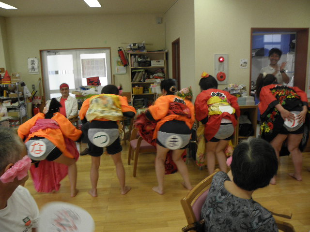 午前・午後ともいつも通りリハビリ・入浴をして頂きまして、最後のレクの時間にて盆踊りをしております。