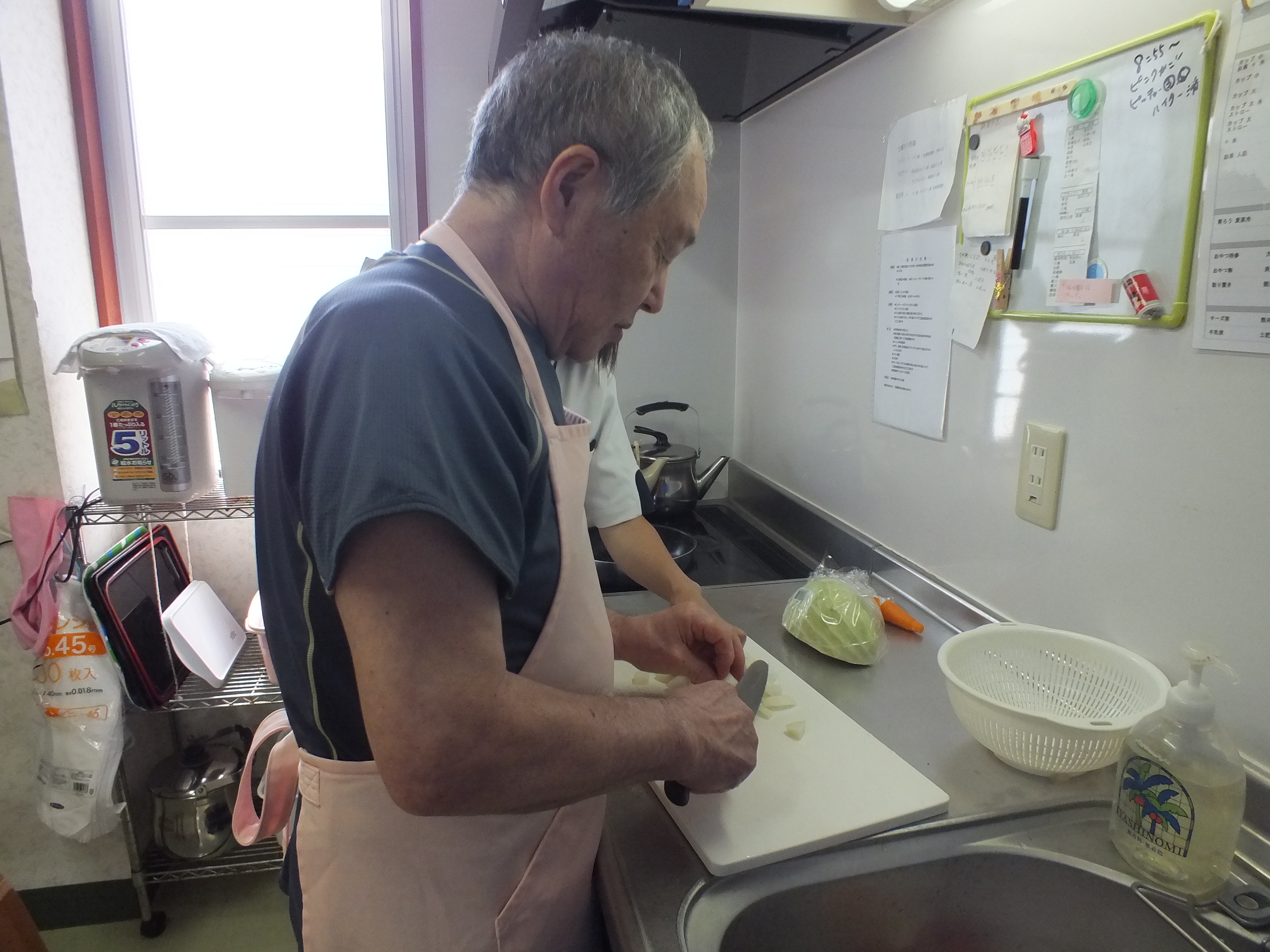 途中で休憩を入れながらも、立位保持で野菜を切っていきます。