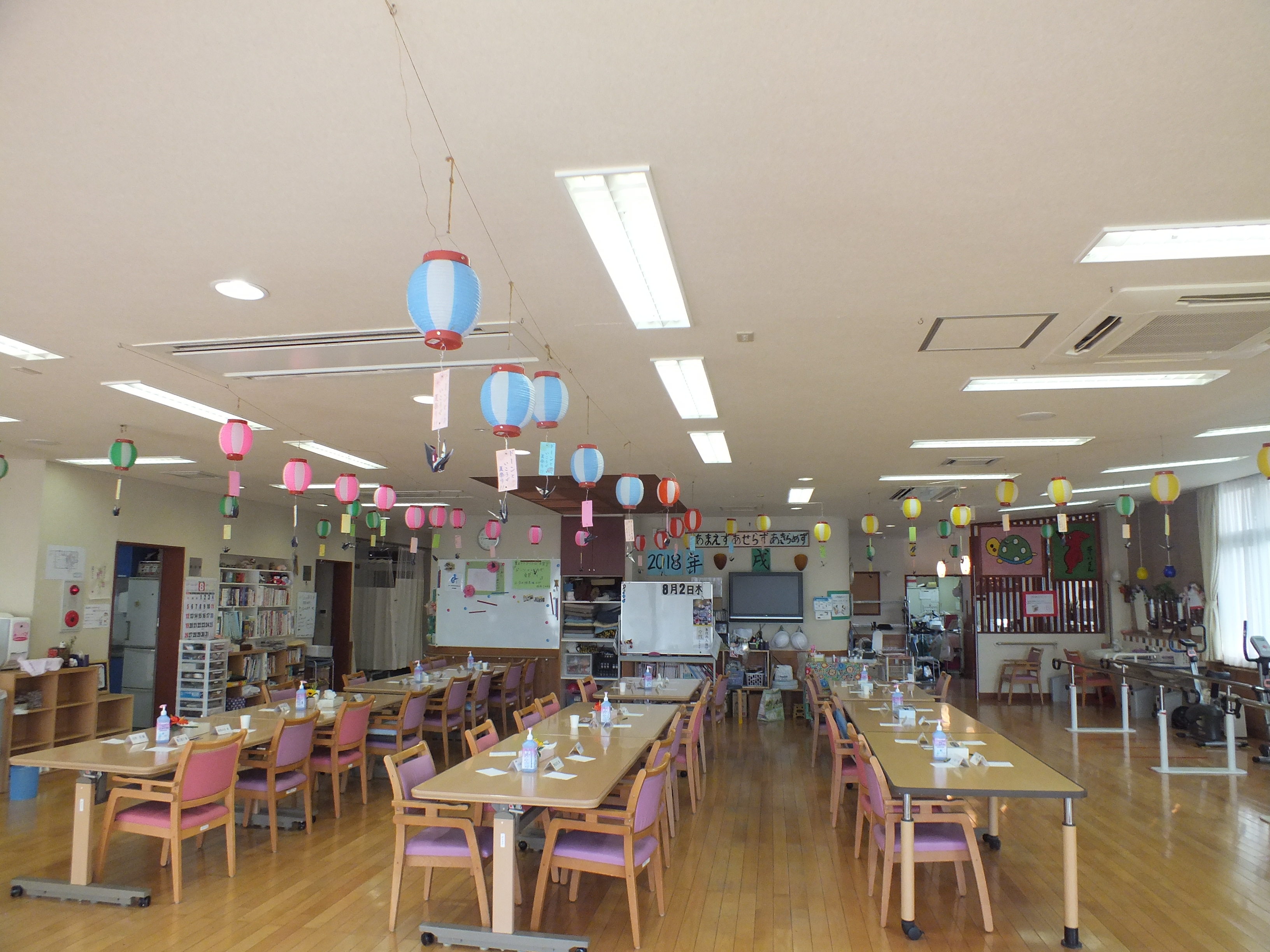 提灯の下には夏祭りの名前と鶴が飾られました。