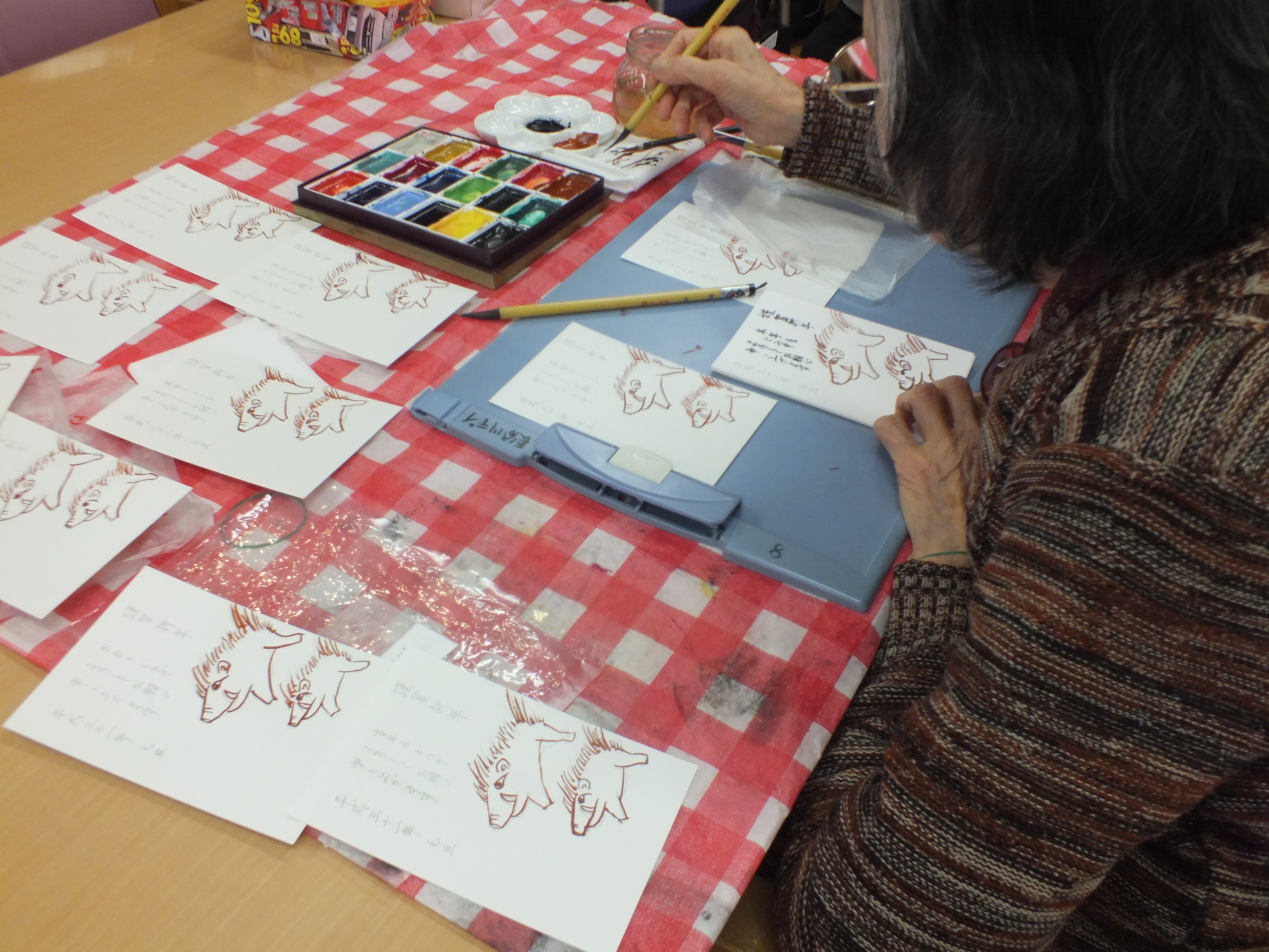 絵手紙で年賀状を描かれています。