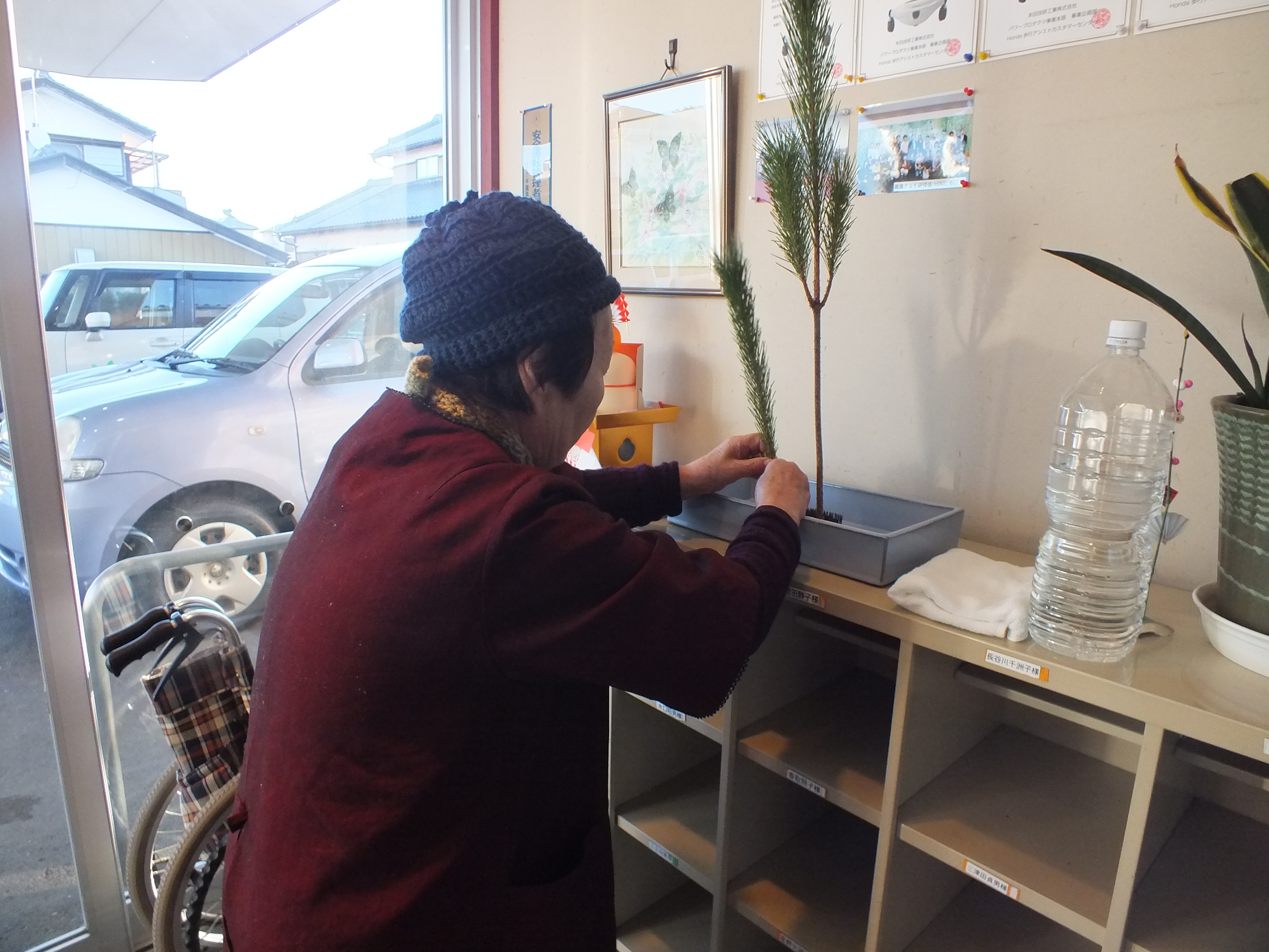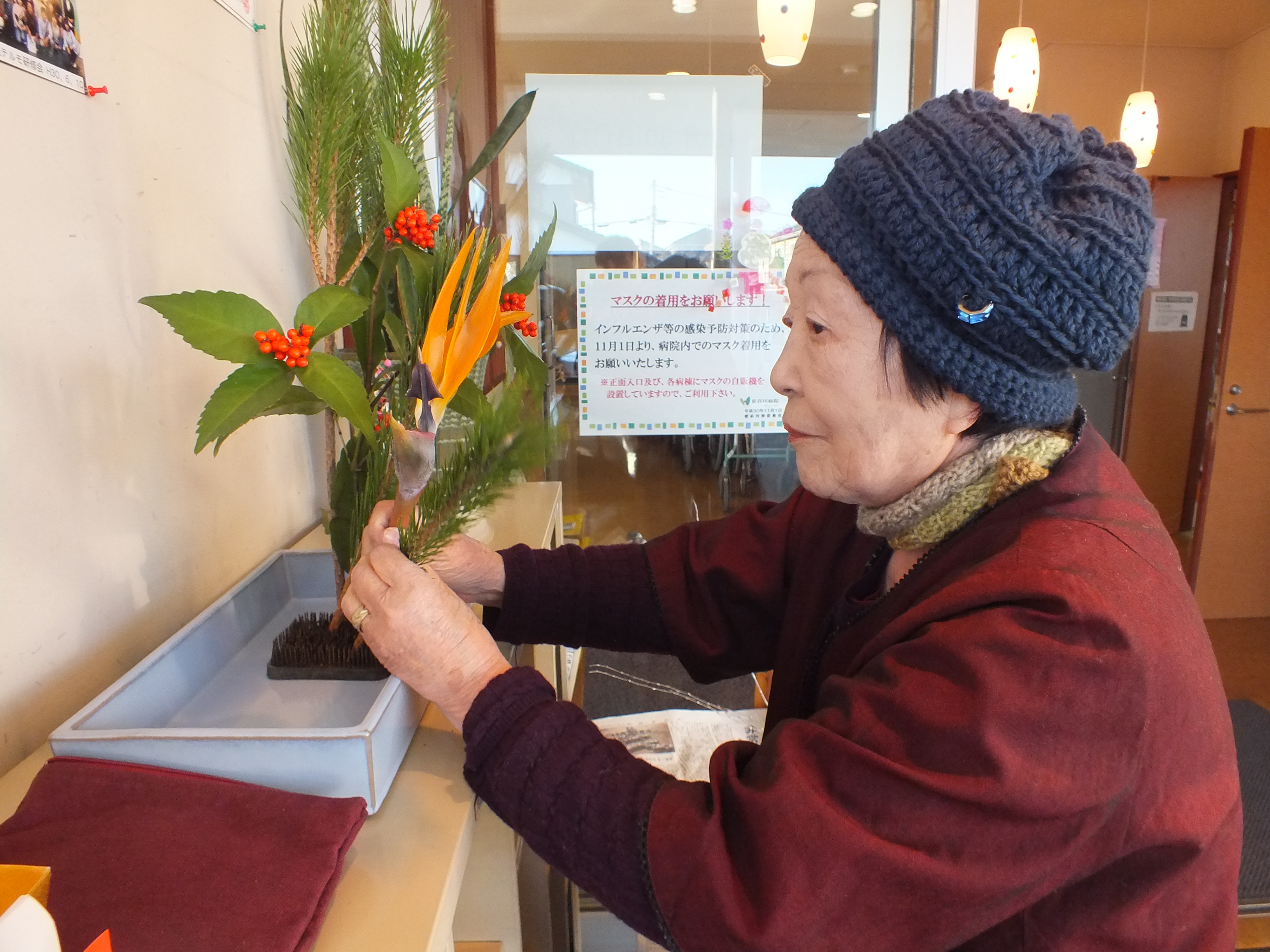 新年初日の本日は、華道の先生をしているご利用者様が玄関に作品を活けて下さいました。