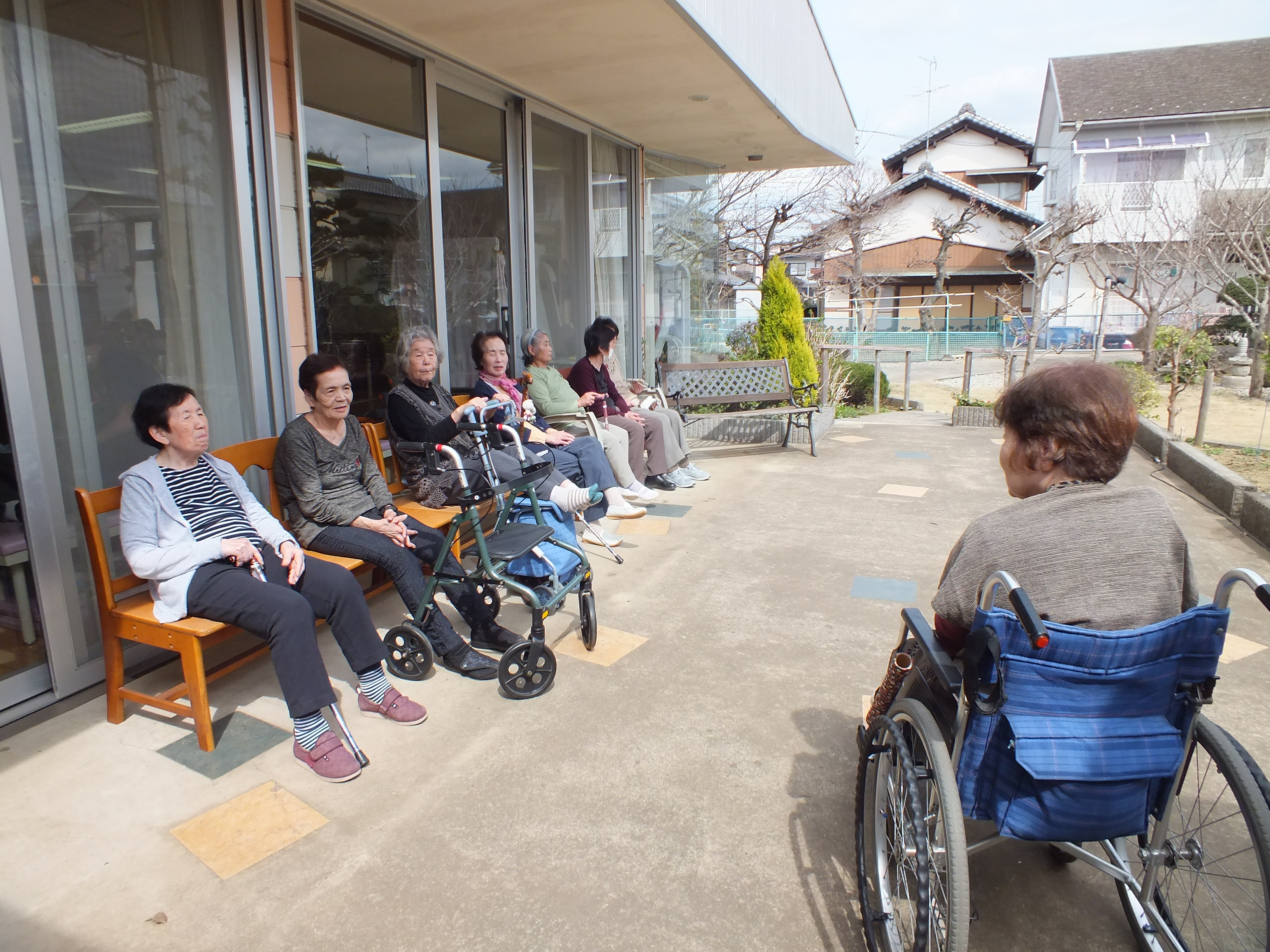 いつもテラスに出ているのは男性のご利用者様が多いのですが、今日は女性のみなさんが外に出て日向ぼっこをされていました。